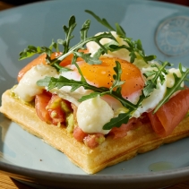 Хрустящая вафля, слабосоленый лосось, яйцо и крем из Камамбера. Подается с гуакамоле, узбекскими томатами и руколой