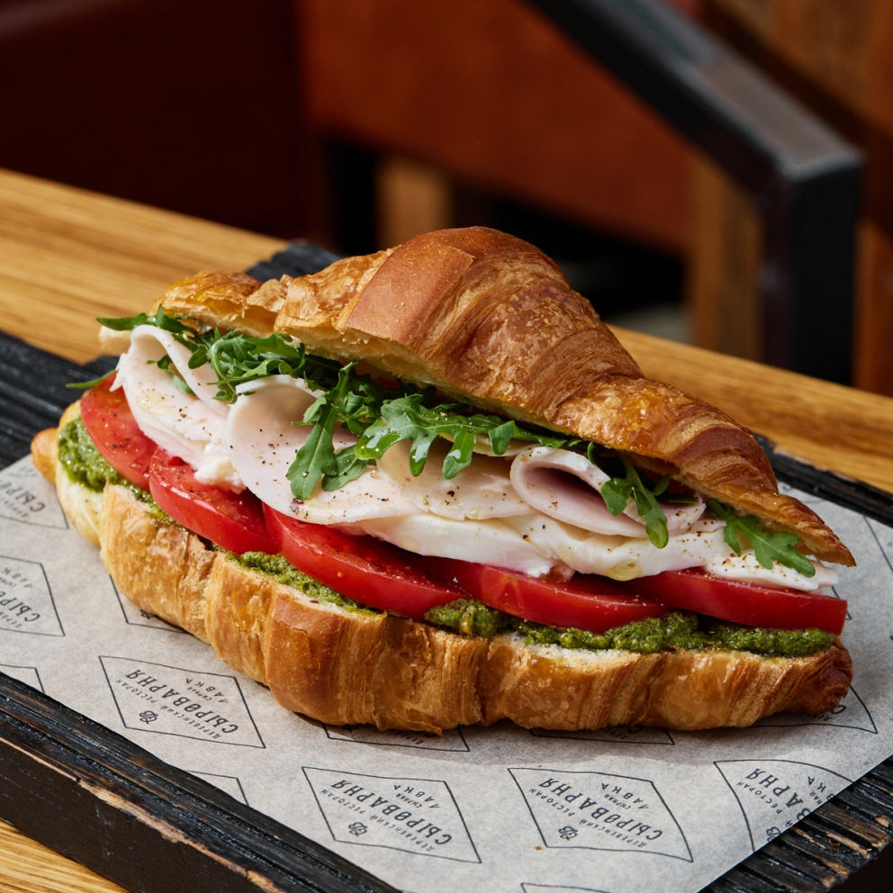 Классический круассан с ветчиной из индейки, Моцареллой, узбекскими томатами, соусом песто и свежей руколой