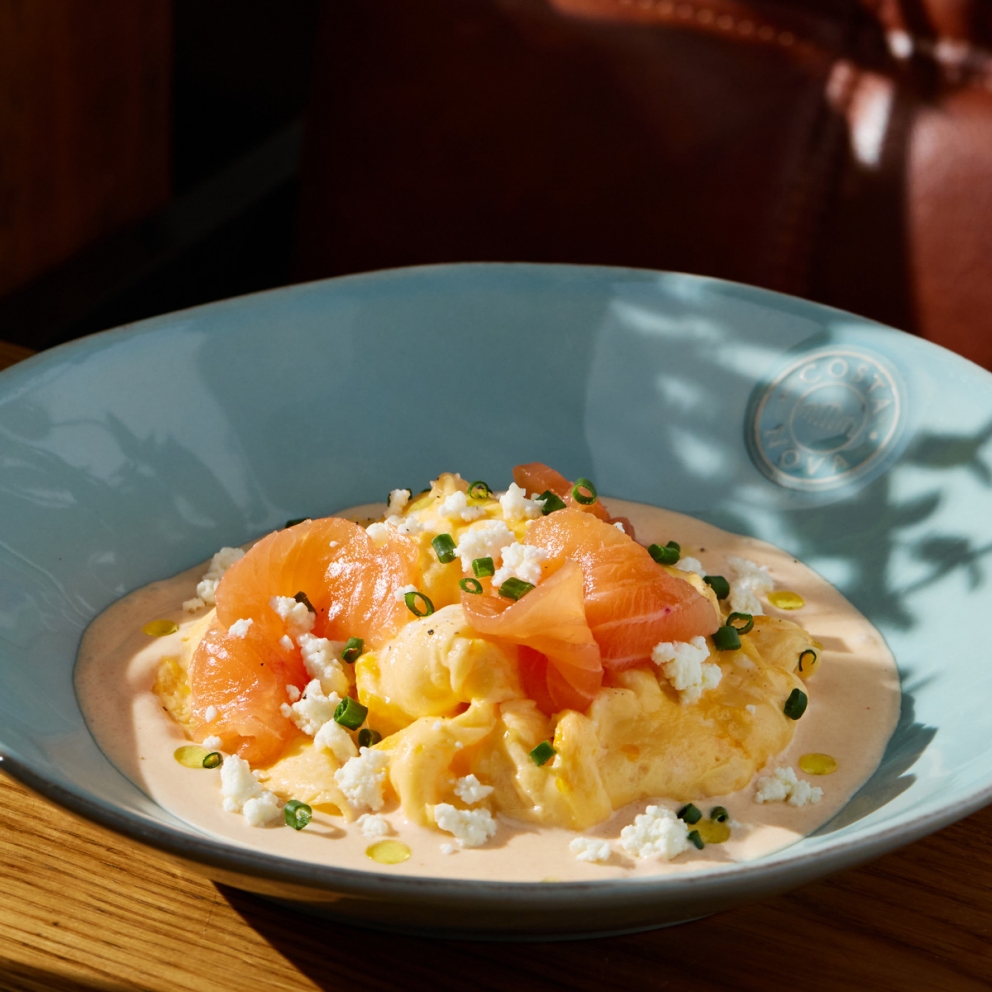 Яйцо куриное, молоко 3,2%, соус сливочно-томатный (сливки 33%, помидоры узбекские, соль морская), лосось слабосоленый (филе), лук зеленый, масло подсолнечное рафинированное, сыр рикотта, масло оливковое
