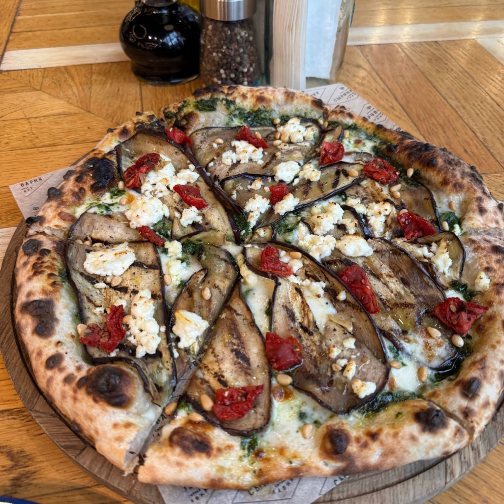 Тесто для пицци, соус песто, моцарелла , баклажан запечённый с чесноком на гриле, рикотта , орех кедровый