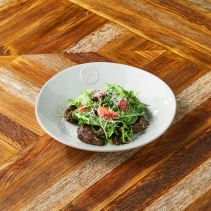 Куриная печень со специями, свежими томатами, миксом салатных листьев, сладким виноградом, Пармезаном и бальзамическим кремом