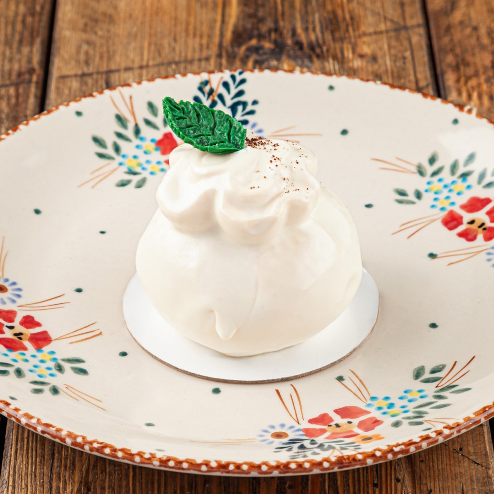 Муссовое пирожное из воздушного ванильного мусса с начинкой из малинового желе