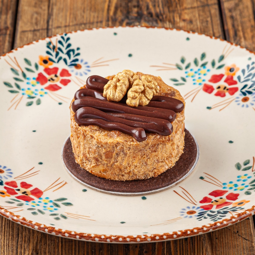 Молоко сгущенное вареное, масло сливочное 82,5%, желток, сахар, вода, кислота лимонная), миндальное сабле (мука пшеничная в/с, масло сливочное 82,5%, пудра миндальная, яйцо, соль) грецкий орех обжаренный), гляссаж шоколадный (гель нейтральный прозрачный, шоколад каллебаут 54%, сливки 35%), сабле шоколадное (мука, пудра сахарная, мука, яйцо, пудра миндальная, какао каллебаут, соль), грецкий орех обжаренный, бисквитная крошка (яйцо, сахар, мука пшеничная в/с, какао каллебаут)