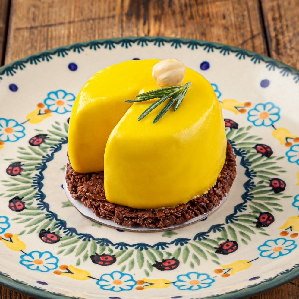 Мусс пралине (сливки 35% , молоко 3,2%, пралине ореховое, желток куриный, сахар песок, желатин листовой), крем сырный (сливки 35%, сыр креметте, шоколад каллебаут 54,5%), хрустящее пралине (крошка вафельная, пралине, шоколад каллебаут 54,5%), начинка (пралине фундук, масло подсолнечное рафинированное), глазурь (шоколад каллебаут белый, масло подсолнечное рафинированное, краситель пищевой желтый), фундук обжаренный, розмарин свежий, гель нейтральный прозрачный