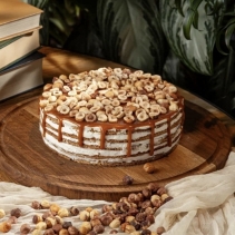 Коржи выпеченные (мука пшеничная в/с, яйцо куриное, сахар песок, коньяк, сода пищевая, масло сливочное 82,5%, мед), крем (сыр креметте, сметана 30%, сахар песок, сливки 35% ), карамель соленая (сахар песок, сливки 35%, масло сливочное 82,5%, соль морская), орех фундук