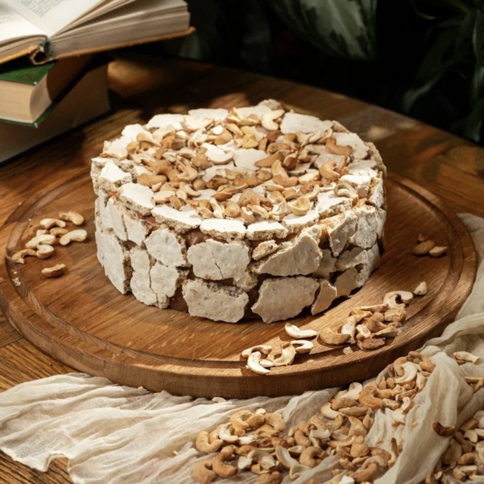 Торт безе с орехами кешью и фундуком в прослойках заварного сливочного и шоколадного кремов, покрытый соусом бейлиз