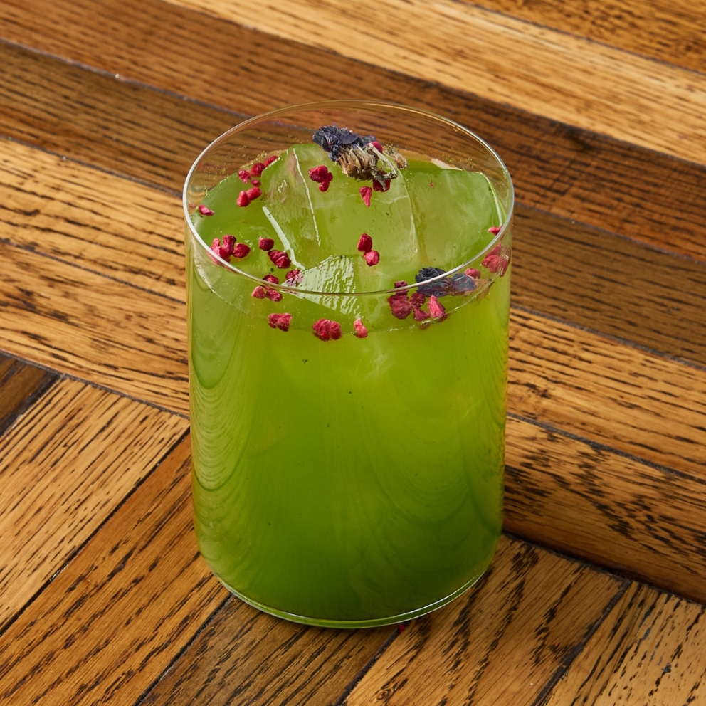 Вода питьевая газированная, пф основа для лимонада щавель-ананас-лаванда, малина сублимированная, цветки незабудки пищевые, лед