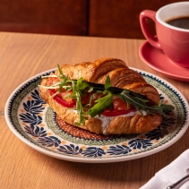Круассан со Страчателлой, слабосоленым лососем, розовыми томатами и руколой