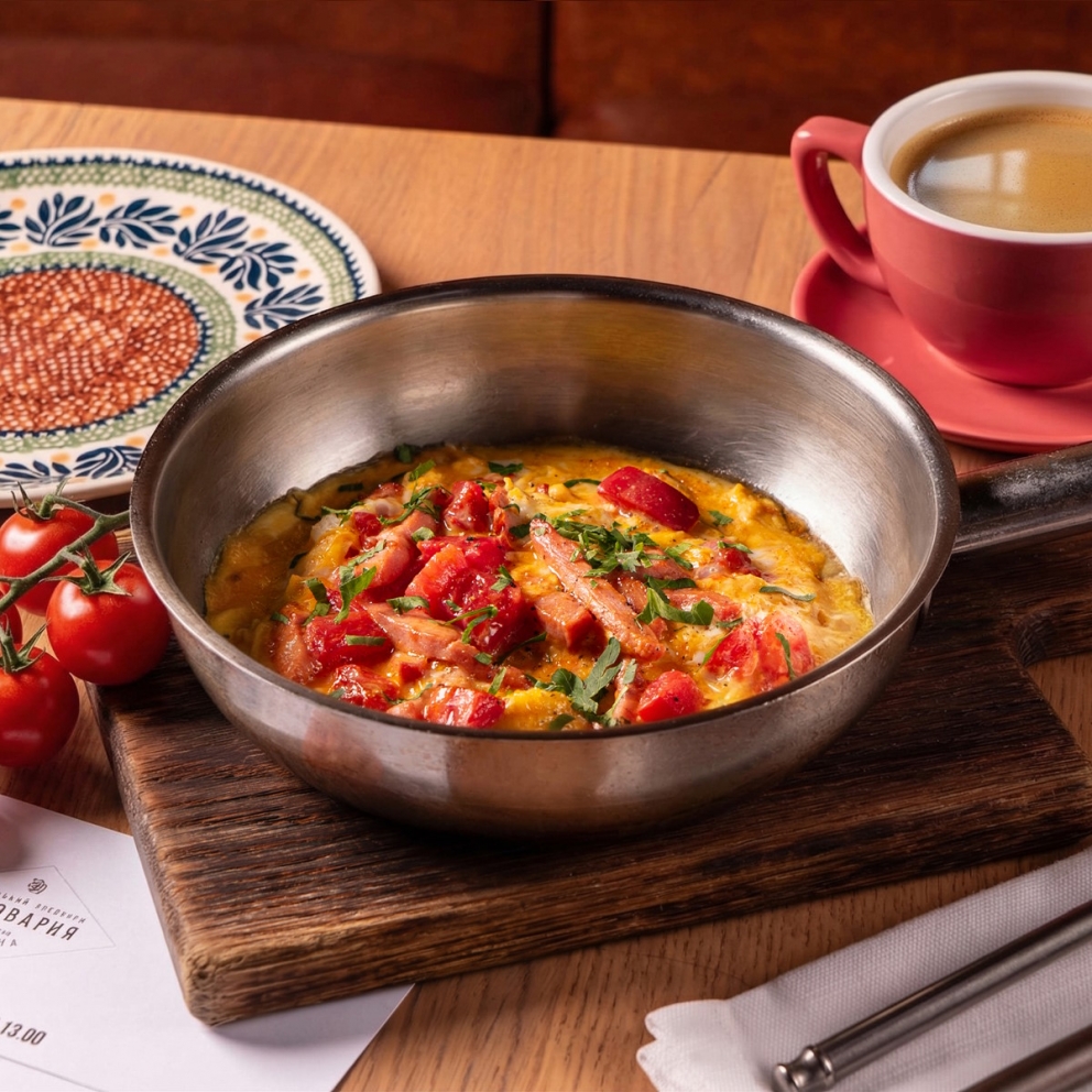 Яйцо куриное, окорок Тамбовский, помидоры, масло подсолнечное, масло сливочное, соль морская, петрушка, перец черный