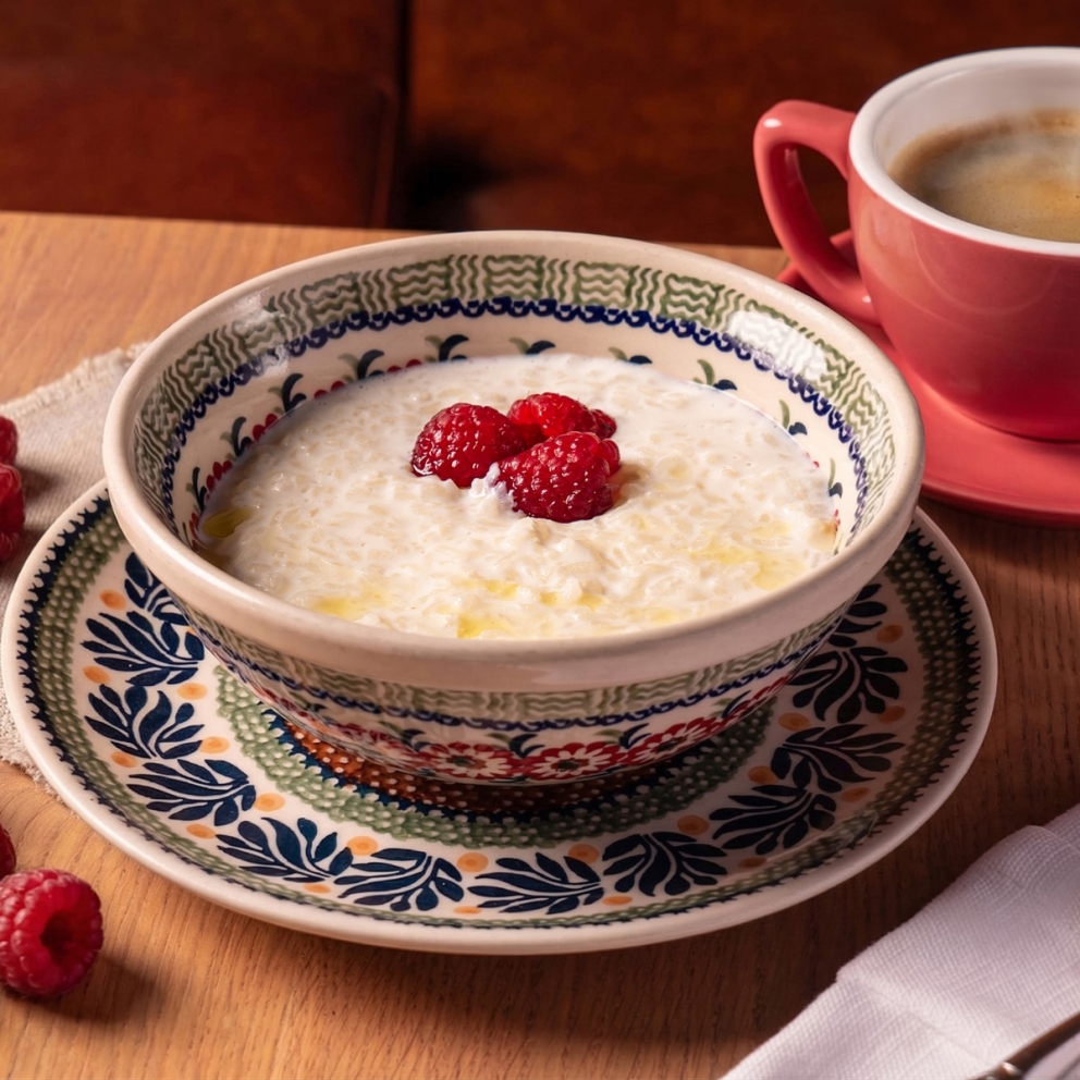 Рисовая каша на кокосовом молоке с добавлением сливочного масла и свежей малины