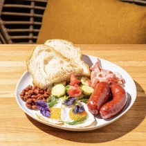 Яйцо куриное, соль, масло подсолнечное, бекон с/к, колбаски барбекю, фасоль консервированная, салат романо, огурцы люкс, томаты узбекские, заправка соево-медовая, микс зелени
