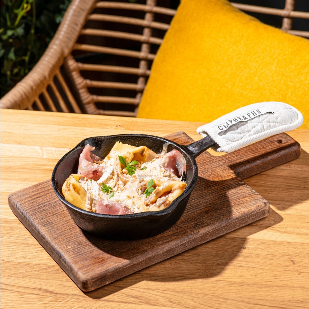 Блины жареные, колбаса мортаделла, трюфельный соус, сыр камамбер, орех кедровый жареный, сыр пармезан, мини-базилик