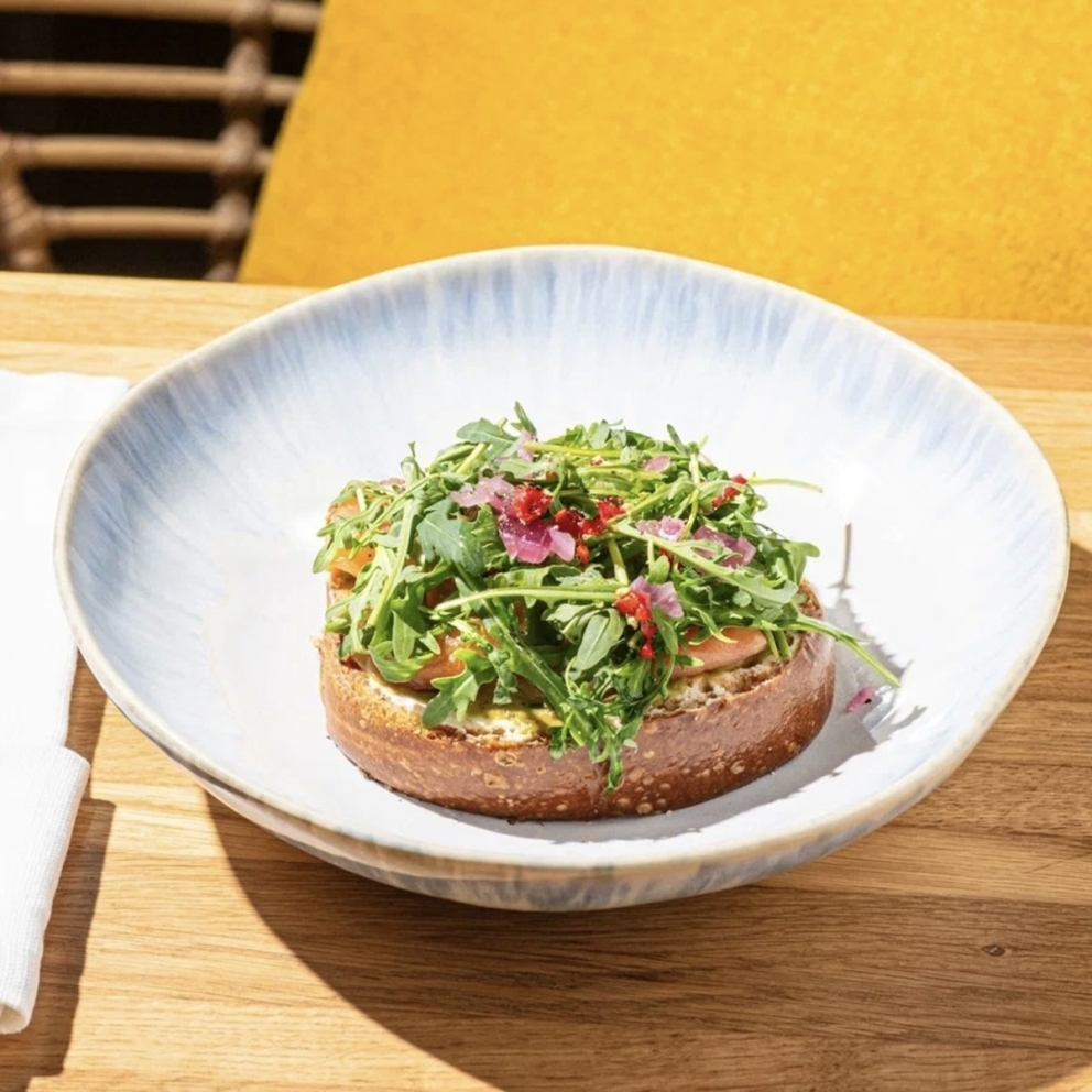 Бриошь, форель, гуакамоле, крем-сметана, маринованный лук, маринованный перец чили, рукола, оливковое масло, горошек перца