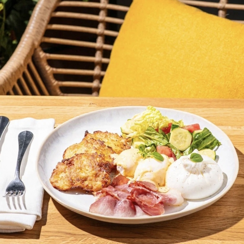 Картофельный драник жареный, салат романо, томаты узбекистанские, огурцы, окорок тамбовский, сыр буратта, базилик мини, соус голландез, перец горошком, масло оливковое, заправка медово-соевая, яйцо куриное