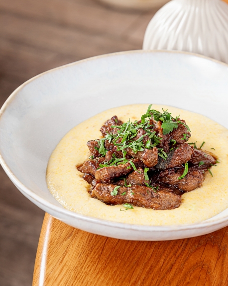 по-венециански с копченой полентой. Взяв за основу итальянскую классику, мы сделали ставку на качество ингредиентов и акцент в виде копечной скаморцы — крафтового сыра, которым так славится «Сыроварня».
