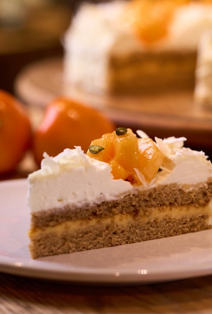 Прослойку из апельсинового крема обрамляет нежный бисквит со вкусом имбирного пряника, укрытый шапкой из сырного крема и хрустящей стружкой из белого шоколада. Главный акцент пирога, задающий общее настроение, – сочная медово-фруктовая хурма, особенно сладкая на фоне воздушного крема и пряного бисквита. Получился по-новогоднему ароматный десерт, погружающий в предвкушение любимого семейного праздника.