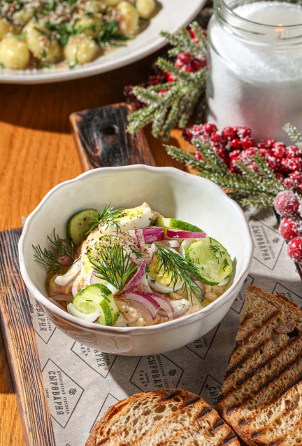Открывают новое меню закуски, вызывающие ностальгию по большому семейному столу: нежнейший форшмак из бочковой сельди с перепелиным яйцом и столичный салат с сочной курицей. В «Сыроварне» взяли за основу любимые с детства рецепты, но пересмотрели их в своем стиле: например, в форшмак добавили сырный соус из рикотты, а куриное бедро для столичного салата обжарили на открытом огне.