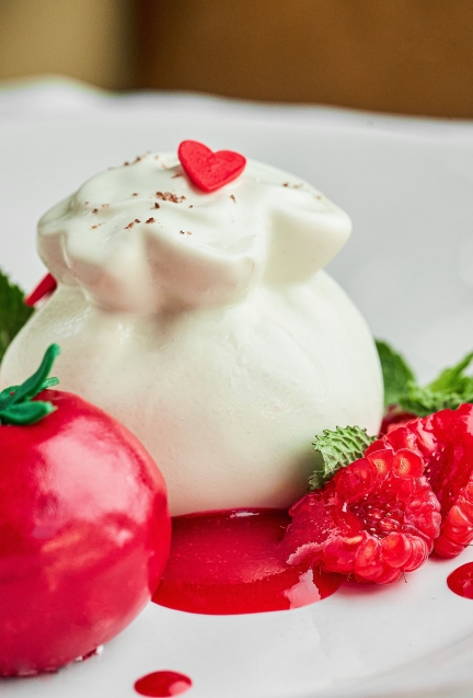 Вы только посмотрите на эту «Сладкую парочку» (520 руб.)! Нежнейшая буррата, выполненная из воздушного ванильного мусса, и сочный томат из малинового крема – такие разные на первый взгляд, но на самом деле у них очень много общего: например, начинка из настоянного на базилике малинового желе, объединяющая «влюбленных» в единую композицию.