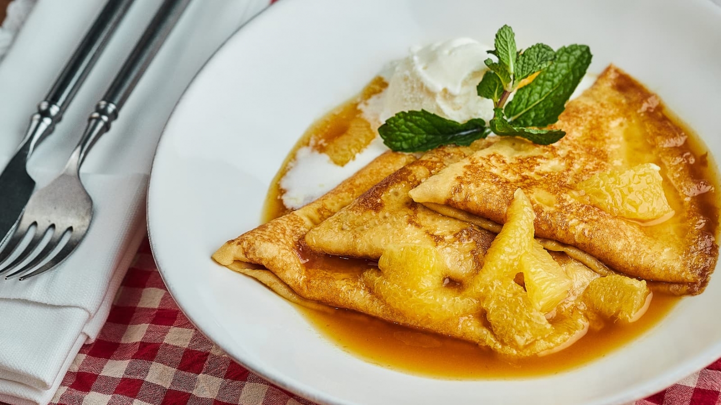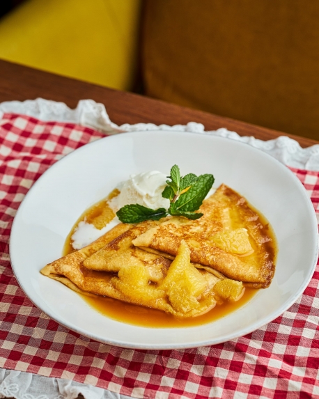 Появилась в меню и французская блинная классика — блины Креп Сюзетт. Тонкие блины, прогретые в соусе из растопленной карамели и апельсинового сока, подаются с шариком ванильного мороженого и мятой и станут идеальным дополнением к чаю или кофе.
