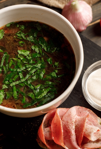 Морковь, свекла, лук, капуста квашенная, томаты, рулька, свинина ребра копченые, петрушка, сметана, бутерброд с черемшой и моченым яблоком.